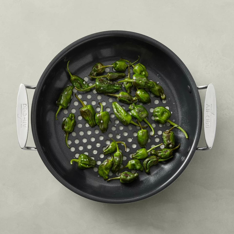 All-Clad brings its signature style outdoors with this non-stick frying pan. Ideal for barbecuing everything from tender summer vegetables to delicate seafood, it’s crafted of brushed stainless steel with a PFOA-free non-stick coating. The pan features large perforations that circulate heat and add delicious smoky flavour, plus a deep rounded basket that contains food so small items are not lost to the grill. Two side handles allow safe, easy transport and are large enough to accommodate oven mitts.