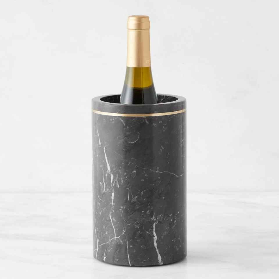 Keep white wine, rosé and sparkling varietals chilled in elegant style. Hand carved of black marble, our exclusive chiller naturally retains the cold to keep wine cool. It’s accented with a gleaming brass ring. Variations in the colour and pattern of the stone make each chiller unique.