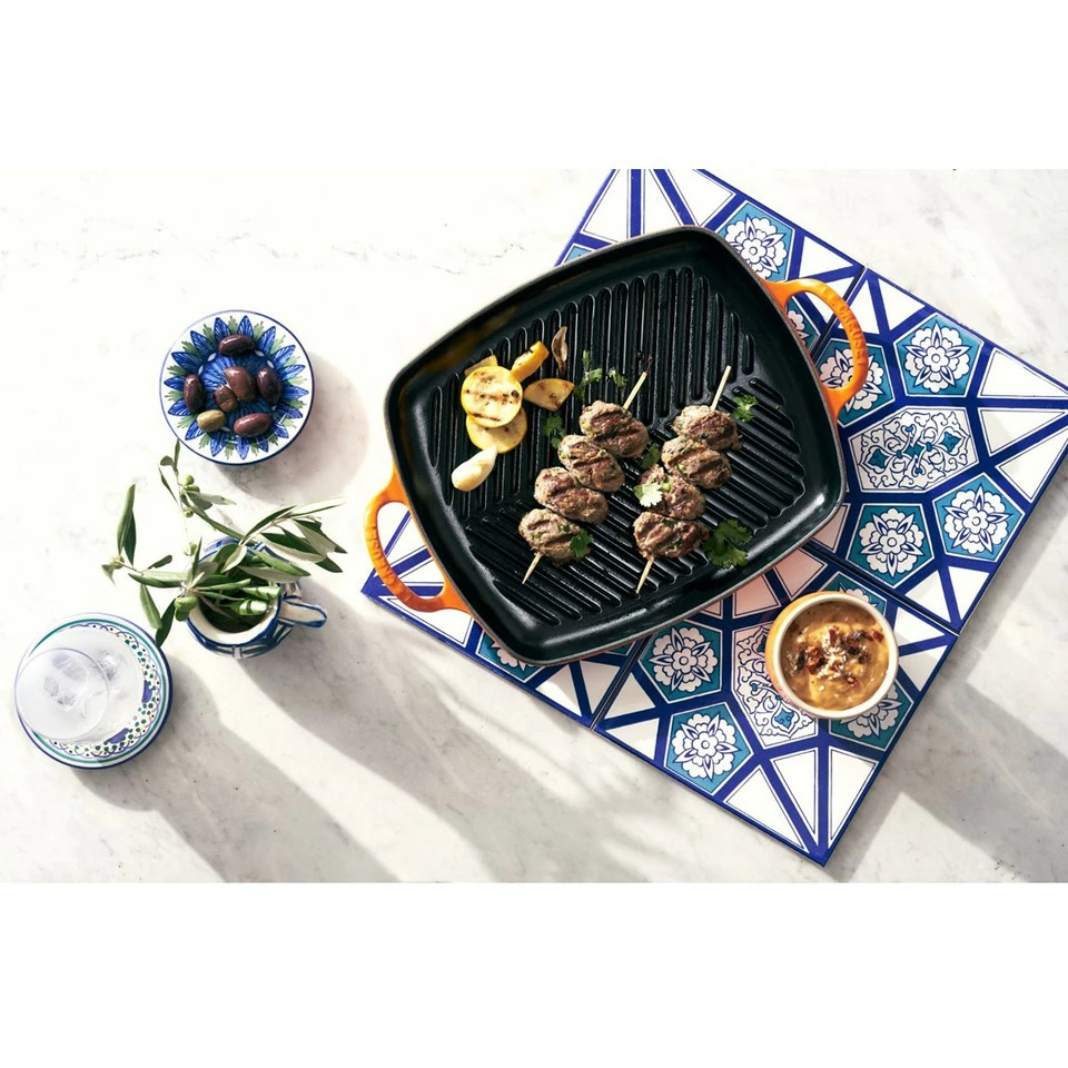 Simple, healthy cooking starts with this French enamelled cast-iron grill pan – it performs equally well indoors or out. Use it to grill everything from fresh seasonal vegetables to sizzling steaks and prawns. High ridges sear food with authentic grill marks, while keeping it separated from fatty drippings.