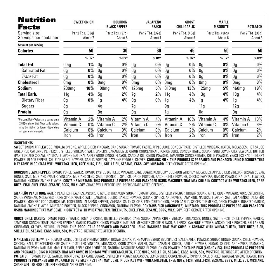 - Bourbon Black Pepper: Tomato puree (water, tomato paste), distilled vinegar, cane sugar, Kentucky bourbon whiskey, molasses, apple cider vinegar, brown sugar, honey, salt, mustard (water, vinegar, mustard seed, salt, turmeric, spices), spices, onion powder, ancho chile powder, natural flavours, garlic powder, natural hickory smoke flavour.