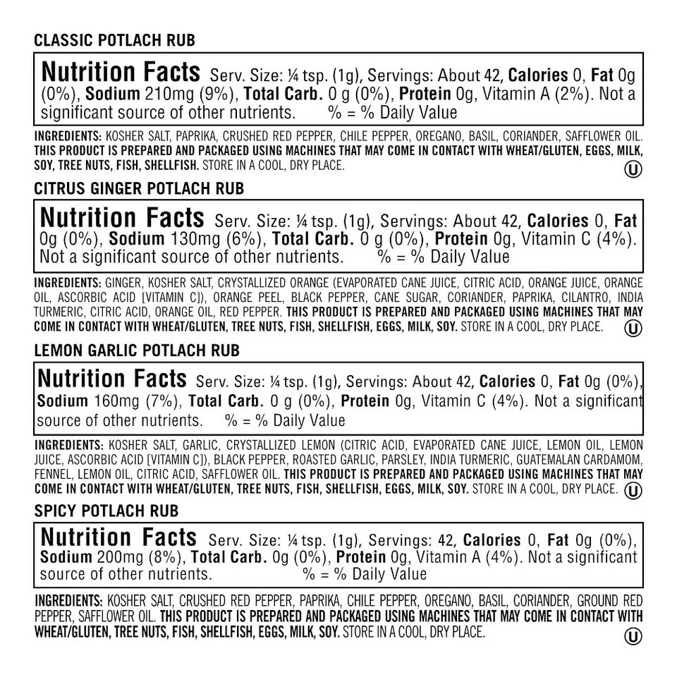 Our sampler of potlatch rubs is inspired by the natural botanical seasonings that Pacific Northwest Indians once used to prepare salmon for their ceremonial feasts. Packaged in mini tins, the collection of seasonings includes our classic flavour plus three lively twists: Spicy, Citrus Ginger and Lemon Garlic.